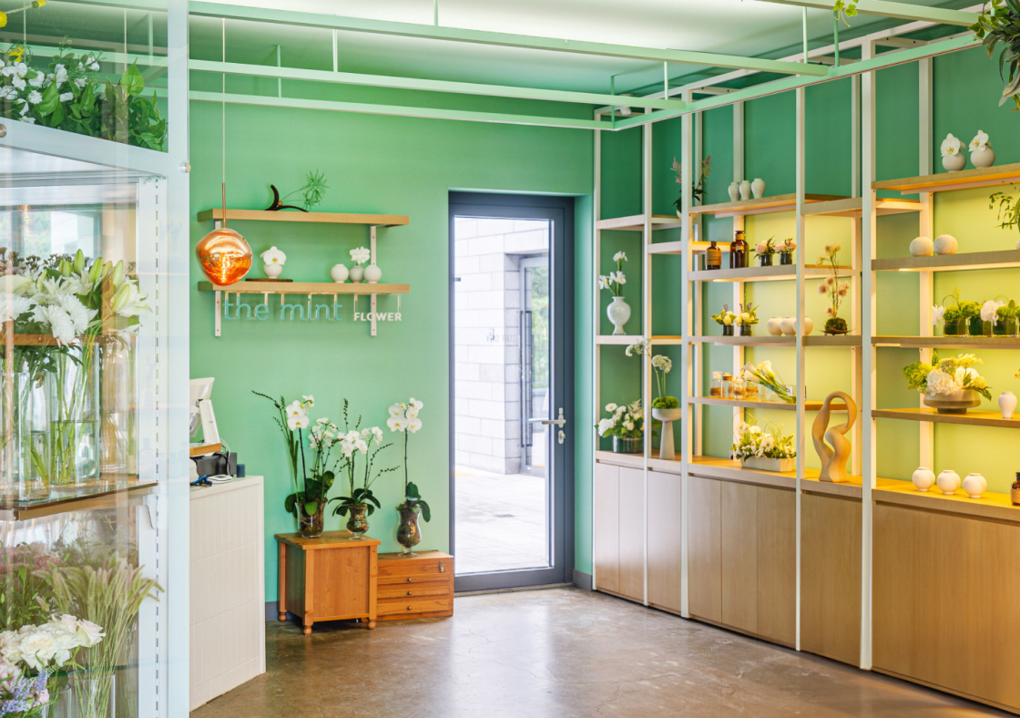 창 너머로 보이는 단정한 정원, 내추럴한 꽃과 식물들이 가득한 공간